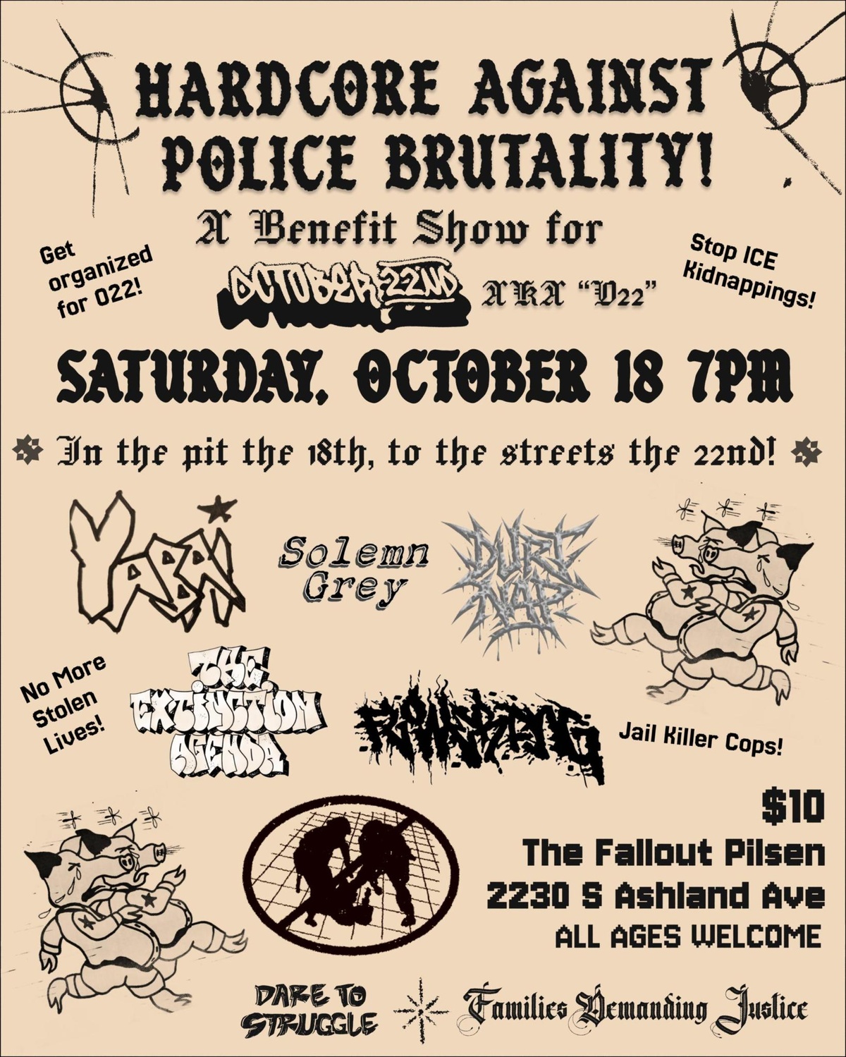 Join us in building up for the National Day of Protest Against Police Brutality (O22) by coming through for a night of hardcore. All proceeds will go to support impacted families in Illinois and other O22 related costs!