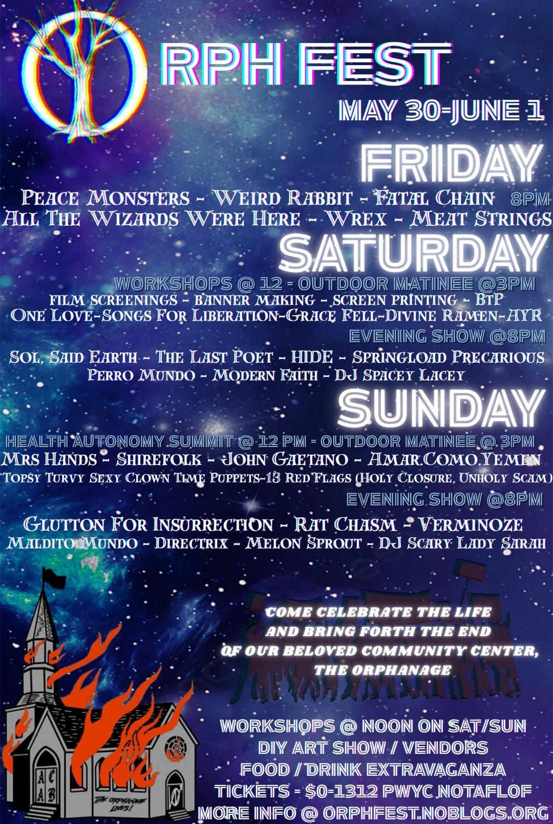 Night time: Bands and DJs! Come Celebrate The Life and Bring Forth The End Of Our Beloved Community Center: The Orphanage