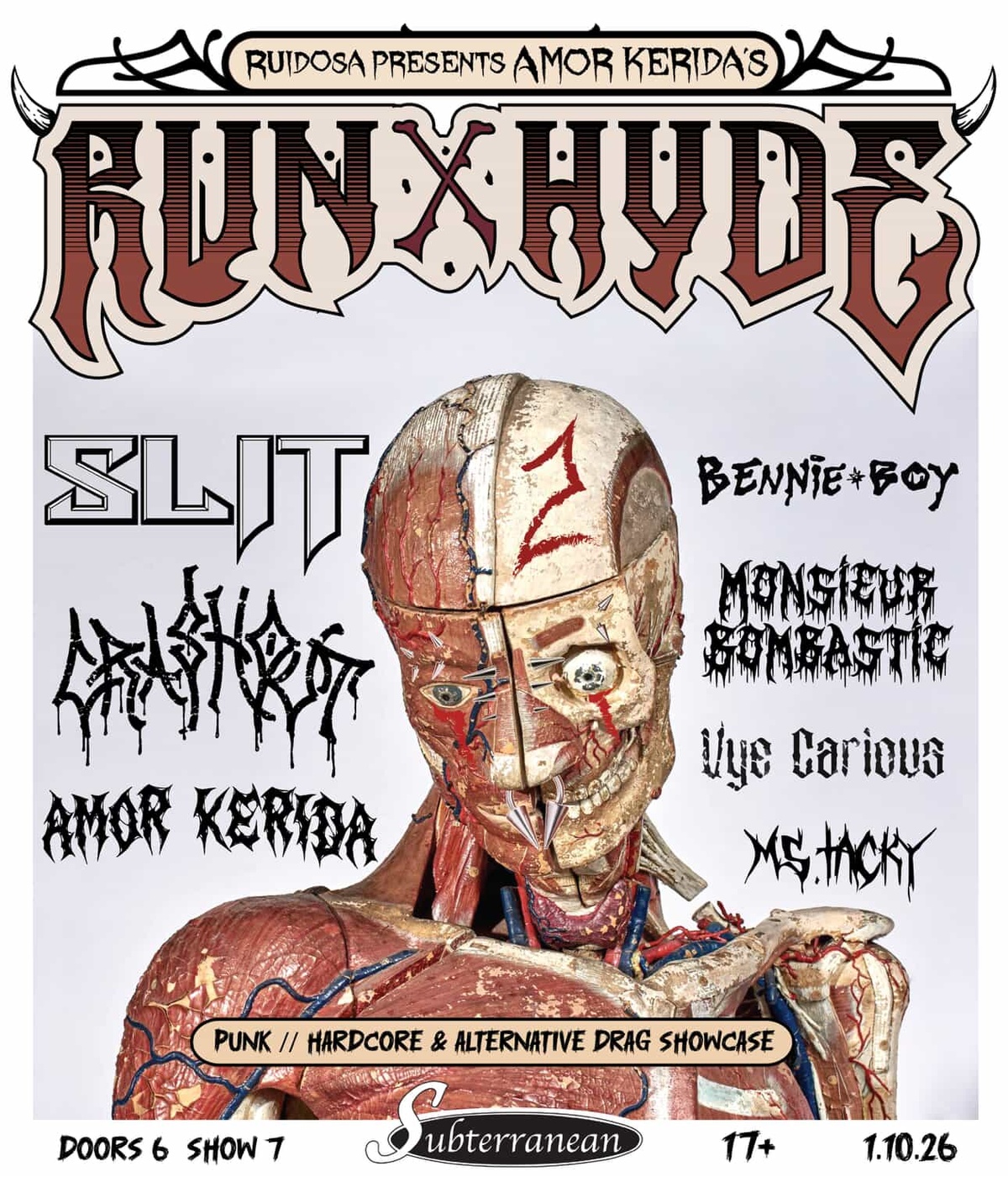 Ruidosa Art Collective presents AMOR KERIDA’S : ‘ RUN X HYDE’ , the only of its kind merging Chicagoland Punk/ Hardcore Bands and Alternative Drag Performers.