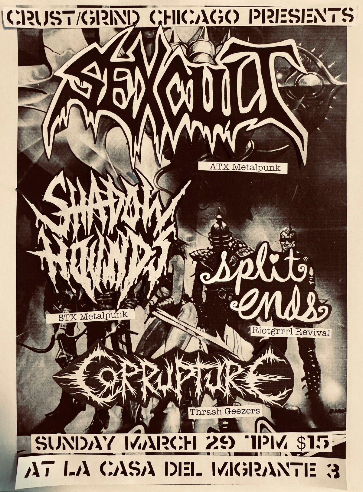 Sexcult Austin Texas and Shadow Hounds (San Antonio) with support from local Riot Grrrls Split Ends and Corrupture.