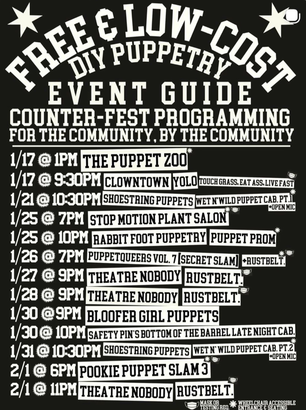 Featuring TEN local DIY groups, showcasing dozens of local puppeteers. We are proud to organize an array of free & PWYC local programming in a time of year where it is often lacking, and where the majority of programming offered often leaves the majority of local puppet artists underemployed and unable to access what we spend year-round building up in Chicago.