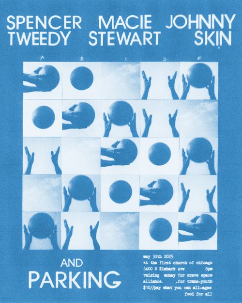 Parking x Spencer Tweedy x Macie Stewart x Johnny Skin Friday, May 30, 07:00 PM-11:00 PM Friday 30 May 23:00 First Church of Chicago 6400 S. Kimbark
