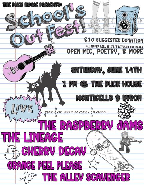 School’s Out Fest Saturday, Jun 14, 12:00 PM-07:00 PM Saturday 14 June 19:00 The Duck House DM for address All AgesAlternativeart punkchicagochicago diyfolk punk